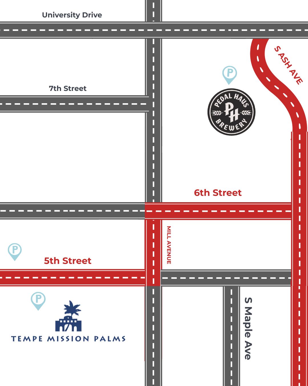 - Continue a few blocks, then turn right on 6th Street — you’ll see Pedal Haus Brewery at the end of the street!